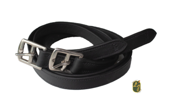 Stijgbeugelriemen in zacht kalfsleder verstevigd met nylon, rvs gesp.