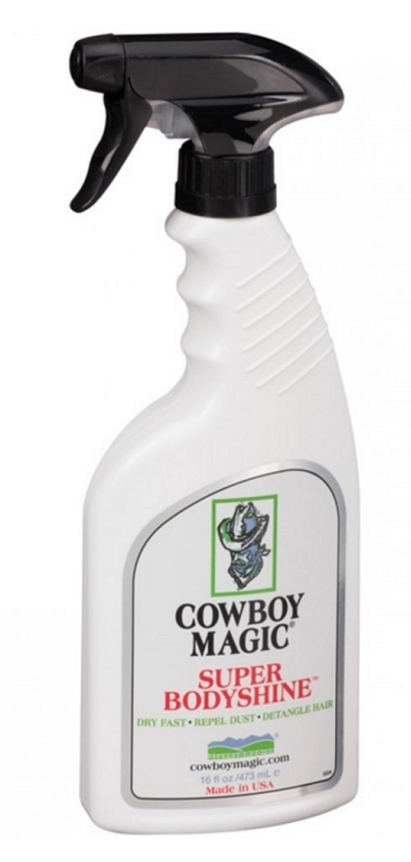 Cowboy Magic Super Bodyshine 473ml. Dit product geeft het haar een zijdezachte glans en een heerlijke geur. Het werkt snel en irriteert niet. De formule zorgt ervoor dat het natuurlijke lichtspectrum gereflecteerd wordt, waardoor er in het zonlicht of onder de lampen van de showring een MAXIMALE, ZIJDEZACHTE EN HELDERE GLANS onstaat.