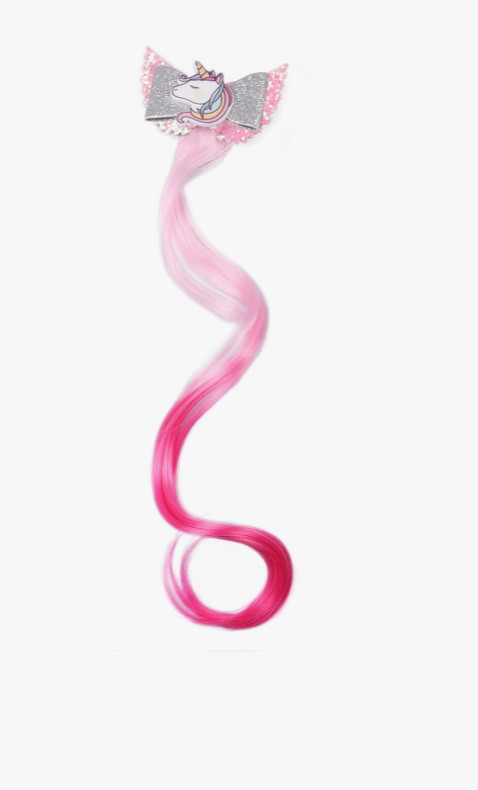 Deze haarclip maakt elke look gelijk vrolijk. De extension met roze ombré gekleurd haar en glitter is gedecoreerd met een eenhoorn op een rozet met vleugels. De haarclip kan gemakkelijk met een stevige clip in de staart van jouw paard of pony worden bevestigd.