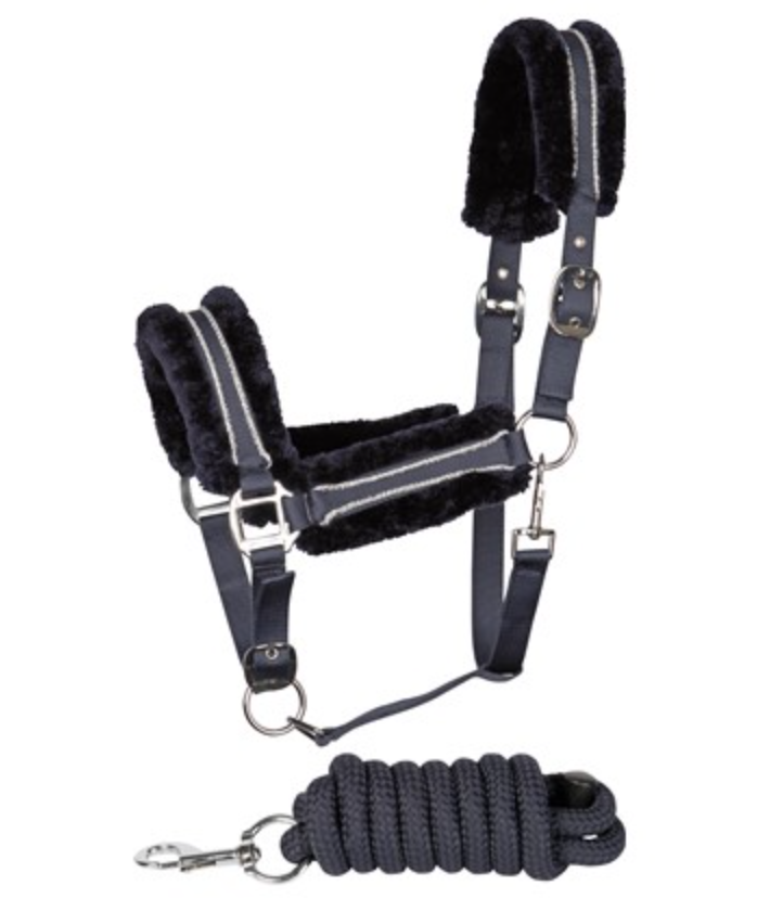 Halsterset met bont onderlegd, metallic pipings, verstelbaar aan twee kanten op het kopstuk en op de kin, inclusief een twee meter halstertouw.