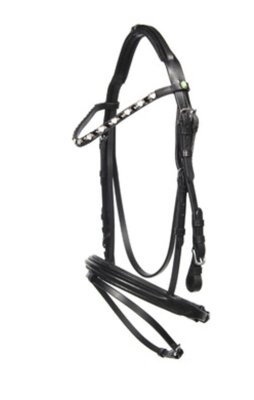 Hoofdstel in buffelleder, met gecombineerde neusriem die zwart of wit onderlegd is. De frontriem is afgewerkt met zwart en witte hartvormige steentjes. Met chroom gespen en antislip teugels met stoppers. PS zwart-wit