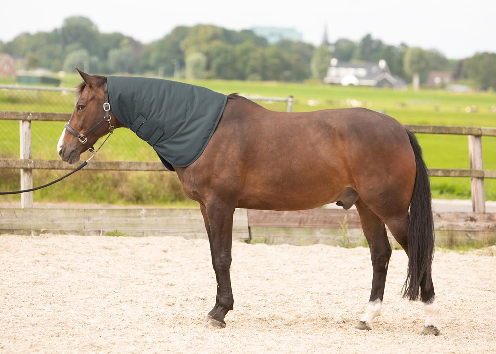 Naadloos halsdeel van waterdicht en ademend 600d ripstop. Drie klittenbandsluitingen bevestiging aan de deken. Voering met polyester tegen het afschuren van de manen. Vulling is 200g polyfill.
